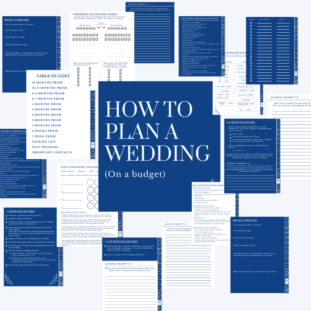 *Theme + aesthetic brainstorm pages, budget-friendly inspiration, vendor communication guides and contract reading tips, contact logs where you can keep track of booking status, packing lists, and more!